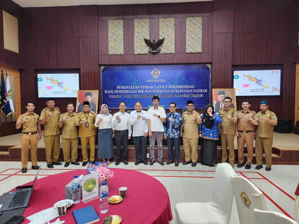 Bengkulu - Bertempat di Ruang Aula Kantor BPK Perwakilan Provinsi Bengkulu dilaksanakan Pemantauan Tindak Lanjut Hasil Pemeriksaan (TLHP) dan Pemantauan Kerugian Daerah Semester I Tahun 2023 pada Pemerintah Daerah se-Provinsi Bengkulu. Pemerintah Kabupaten Bengkulu Tengah pun hadir yang di wakili oleh Inspektorat Kabupaten Bengkulu Tengah dan Inspektur Welldo Kurniyanto, S.E, M.M, CGCAE dan jajaran stafnya.