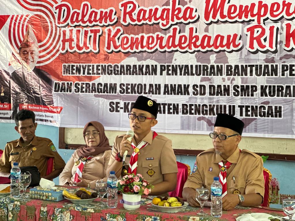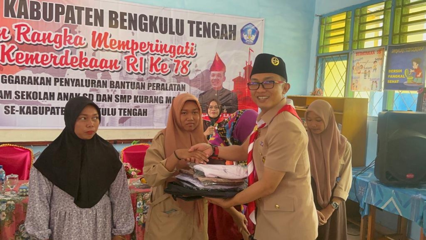 Bengkulu Tengah - Pemerintah Kabupaten (Pemkab) Bengkulu Tengah diwakili oleh Inspektur Kabupaten Bengkulu Tengah Welldo Kurniyanto, S.E, M.M, CGCAE telah menyalurkan 1.140 seragam sekolah gratis dan peralatan belajar bagi siswa kurang mampu, Senin (14/8/2023).