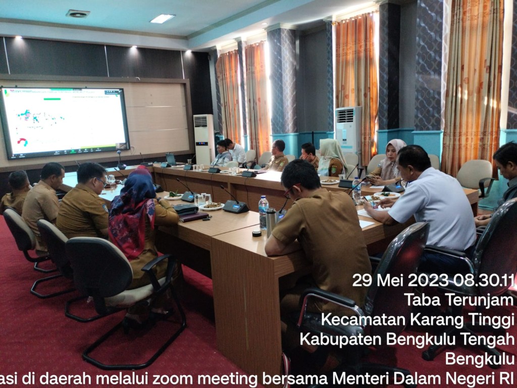 Bengkulu Tengah – Rapat Koordinasi (Rakor) Pengendalian Inflasi Tahun 2023 Bersama Menteri Dalam Negeri RI Bapak Tito Karnavian secara virtual dari Gedung Bhakti Praja yang diikuti oleh para Menteri/Kepala Negara Pemerintah Non Kementerian, Gubernur, Bupati dan Walikota se-Indonesia , Senin (29/5/2023). Dalam Rakor Zoom TPID Pemkab Bengkulu Tengah dihadiri oleh Asisten III Bapak Elyandes Kori, S.E, M.Si dan Inspektur Bengkulu Tengah Welldo Kurniyanto, S.E, M.M, CGCAE.